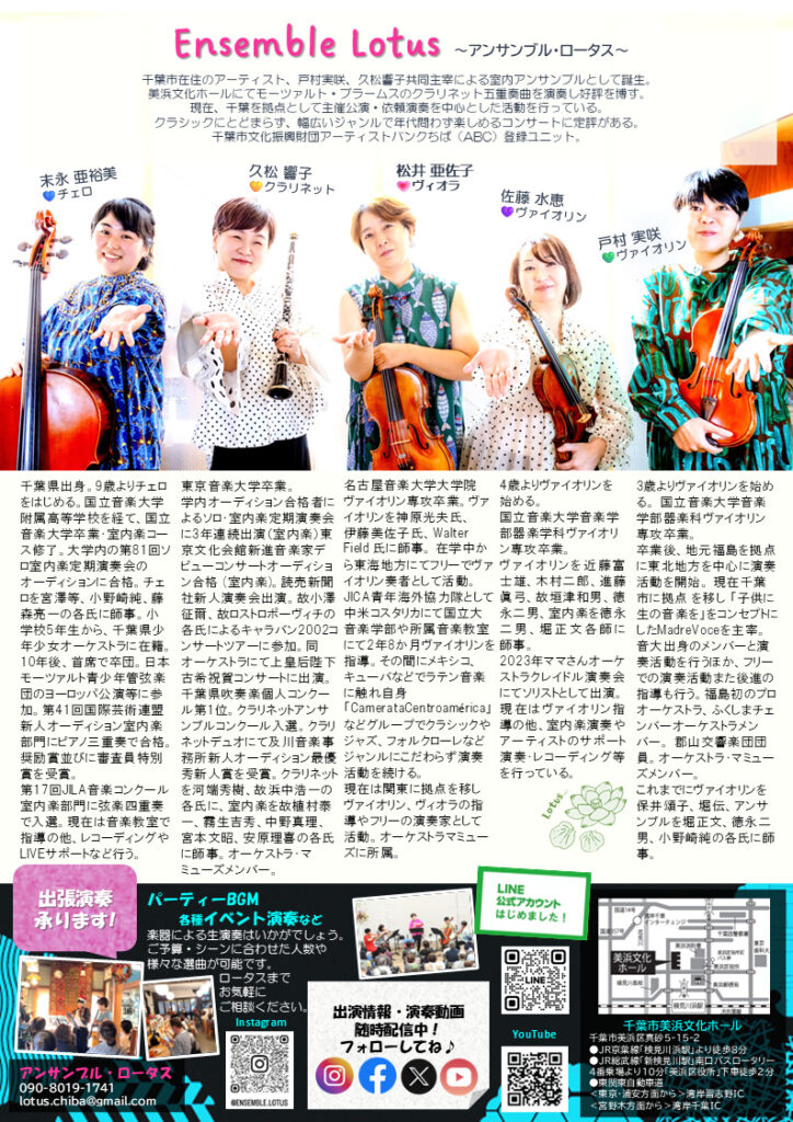 西千葉在住のプロバイオリニスト戸村実咲氏の主宰する「Ensemble Lotus〜アンサンプル・ロータス〜」(共同主宰 久松響子氏)による演奏会のお知らせです。